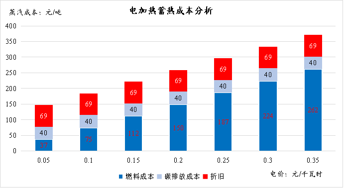 电加热蓄热可以作为天然气供热的一种替代或互补方式。电供热成本受电价影响显著,电加热蓄热充分利用低谷时段电价,只有当平均电价低于0.02元/千瓦时时,蒸汽成本与标准煤价格为1000元/吨时相当,当平均电价低于0.25元/千瓦时时,蒸汽成本相比天然气(价格3.5元/标准立方米)供热更低。