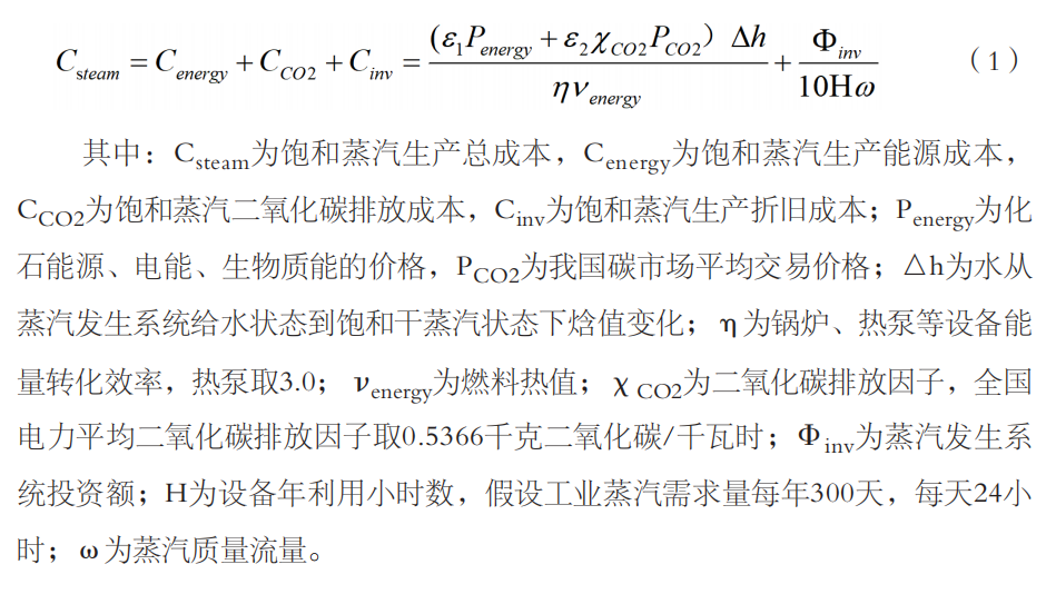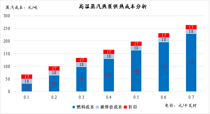 在碳排放成本方面,采用全国电力平均二氧化碳排放因子,对于每吨蒸汽而言,只有当系统COP达到2.65时,对应的碳排放量为0.149吨二氧化碳,与天然气供热碳排放强度相当。
