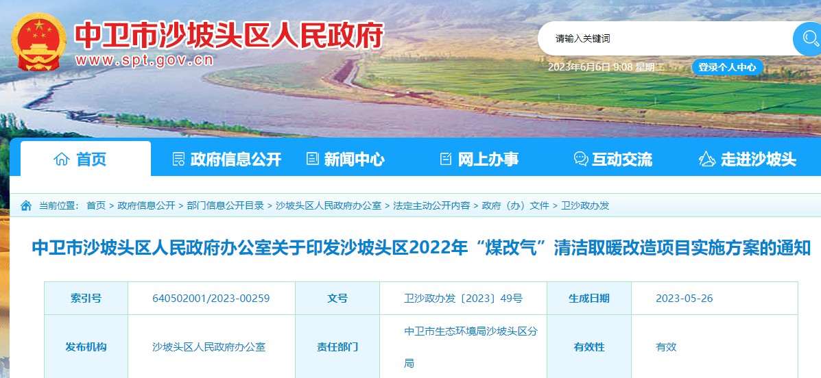 近日,宁夏回族自治区中卫市沙坡头区人民政府办公室关于印发沙坡头区2022年“煤改气”清洁取暖改造项目实施方案的通知指出,经多次调研,原方案计划对宣和镇海和村、兴海村、羚和村、华和村、敬农村、常乐镇康乐村、思乐村、海乐村和永康镇乐台村、永乐村等3镇10村5317户农户“煤改气”清洁取暖改造,实际仅部分农户有改造意愿,无法完成5317户改造目标。为此,需结合各村镇天然气管网覆盖情况,适当扩大改造范围,确定迎水桥镇、东园镇、柔远镇、宣和镇、常乐镇等5镇31个村庄,实施农村居民煤改气5317户,从根本上减少沙坡头区冬季采暖散煤燃烧污染,改善大气环境质量。