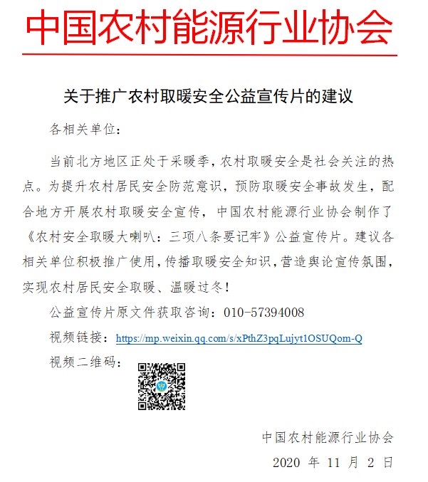 为提升用户安全取暖意识、预防取暖安全事故发生,中国农村能源行业协会制作了《农村安全取暖大喇叭 三项八条要记牢》公益短视频,视频围绕炉具选择、采暖系统安装、日常防范、注意事项等内容进行讲解,通俗易懂、语言诙谐,易于接受和传播,对预防取暖安全事故发生具有重要作用。