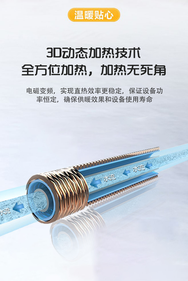 电磁感应加热不仅节能,而且加热速度也是快速的,同时做到健康环保、安全。全自动高能电磁3D发热系统,采用独特的3D动态加热技术,和三维立体全方位加热系统,加热过程没有死角,使用过程中不产生水垢,磁化净化水质。将热能放大化提升,看得见的高效节能。电热转换率高于国内市场热水产品30%,热转换率98% 以上,目前国内热水产品使用半年产生大量的水垢,降低热效15%,一年后下降25%-30%,最后无法使用。市场销售的电加热管采暖炉使用的发热器是陈旧的电热棒,石英管,PTC加热,寿命在几十小时到几百小时(热的快)的加热原理,很不节能, 维修困难或无法修理。电磁加热器在使用过程中无需修理,使用费用特别低。